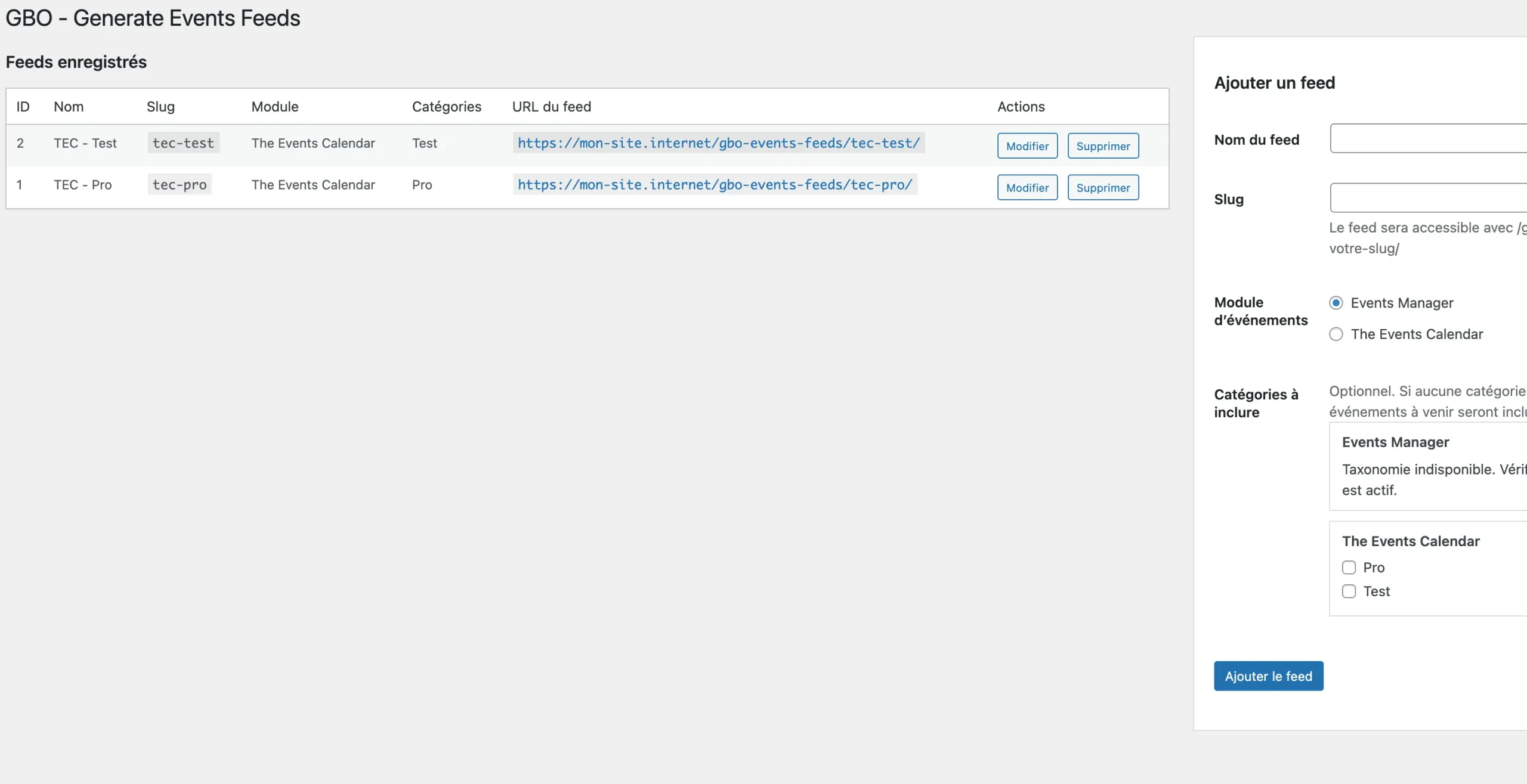 Le module permet de choisir la source d’événements (Events Manager ou The Events Calendar), de filtrer les catégories à exporter, puis de gérer autant de feeds que nécessaire grâce à une interface d’administration dédiée.